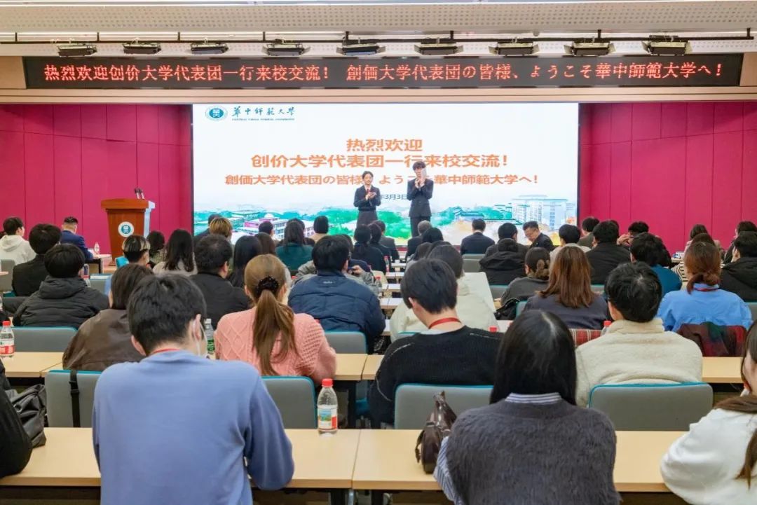 3月3日,由日本创价大学学生部长奥富雅之担任领队的创价大学代表团100余人来校访问,副校长任友洲在新文科楼101报告厅接待来宾。湖北省委外办班子成员、湖北省人民对外友好协会专职副会长司晴川,中国人民对外友好协会有关人员出席会议。外国语学院党委副书记陈哲、日语系主任李俄宪、日语系教师张成、日本籍教师中村王也及日语系学生志愿者参加会议。