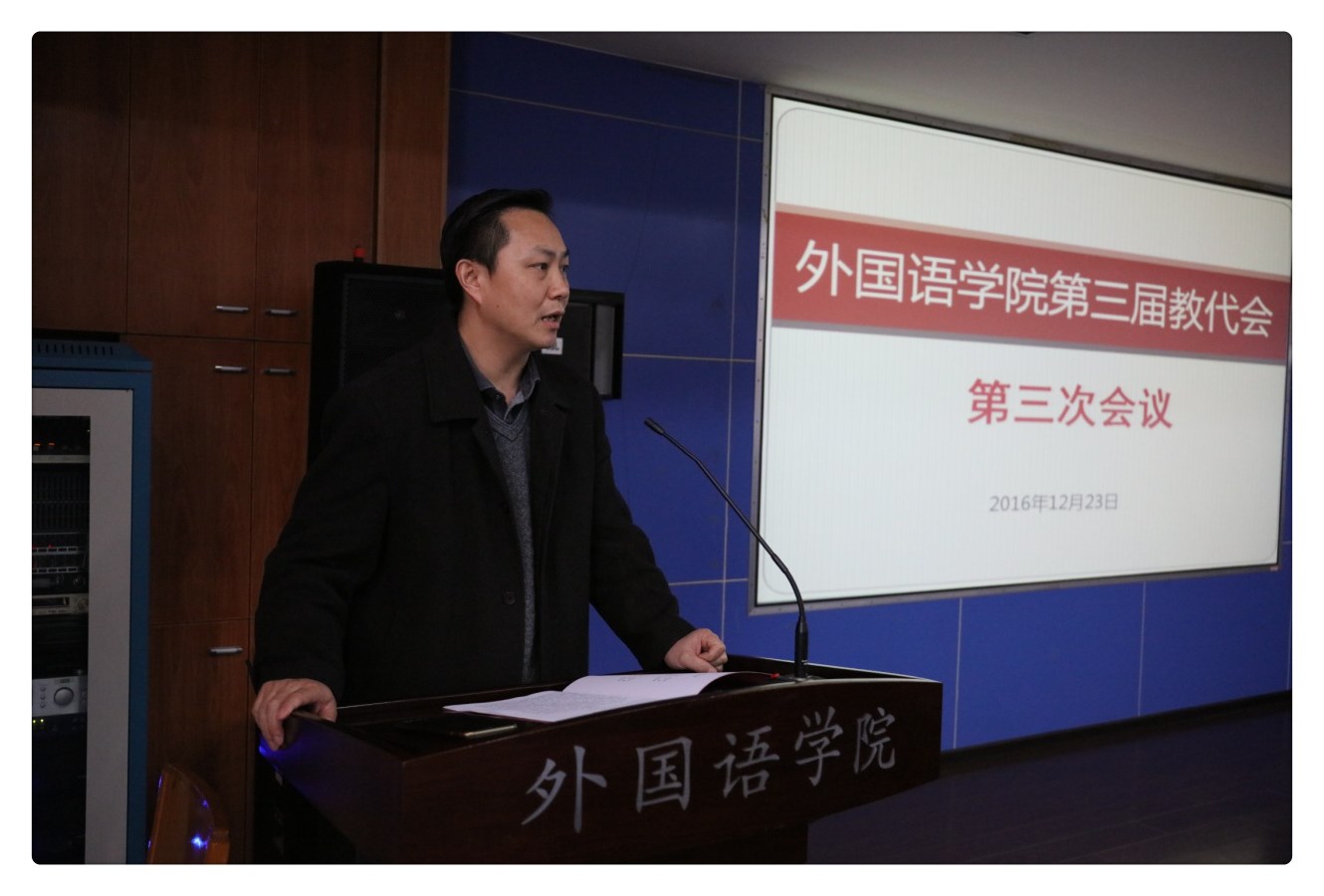 2016年12月23日下午2点,华中师范大学外国语学院第三届教代会第三次会议在三号教学楼3504会议室召开。来自外国语学院行政、英语系、公共外语系、日语系、俄语系、法语系、韩语系的共43名代表参加了本次会议。