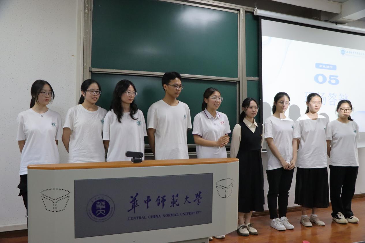 第五组围绕红色文化的公示语展开调查。其团队聚焦公示语言本身,对红色文化地区公示语的多语种应用、位置与布局、线上线下使用状况等方面进行思考研究。第八组负责人王俪霏汇报本组项目,该项目深入探讨了如何利用数字化技术推动乡村旅游业的发展,旨在为江夏区乃至更多地区的乡村旅游提供创新的发展模式。