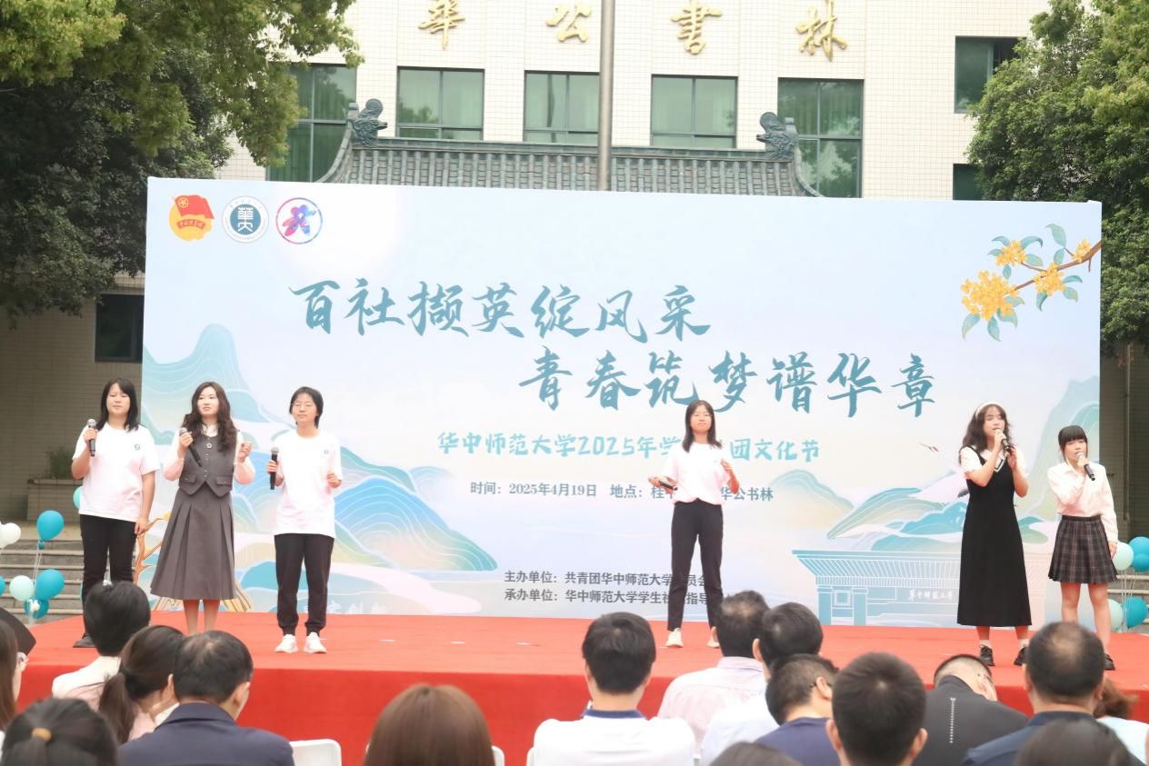 4 月 19 日,华中师范大学 2025 年“百社撷英绽风采,青春筑梦谱华章”社团文化节在桂中路开幕。外国语学院党委副书记陈哲,学院团委副书记(学生)王怡、熊诗韵及学院团委社团部全体同学参加开幕式。
