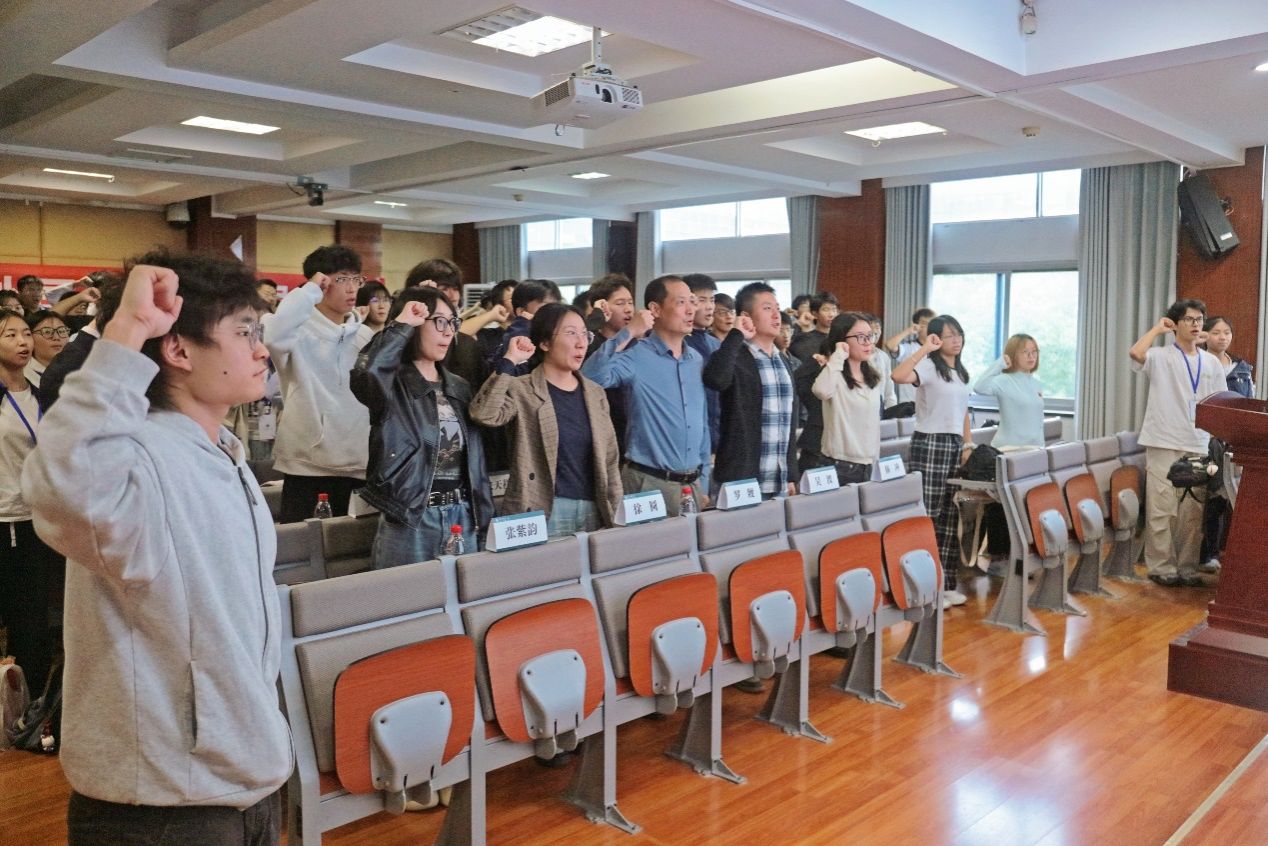 运动员代表岳银鹏带领全体运动员宣誓。青春无畏,逐梦扬威。相信经过系统科学的训练,外院全体运动员能够在赛场上勇往直前,展现活力风采。让我们期待外院运动员们在后续赛事中的精彩表现!