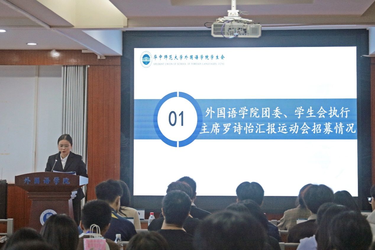 学院团委、学生会执行主席罗诗怡介绍了往年外院运动会成绩,汇报了今年运动会各项筹备情况。她鼓励全体同学继续发扬顽强拼搏的优良传统,科学训练,积极备战,充分展现外院学子的青春风采和体育精神。