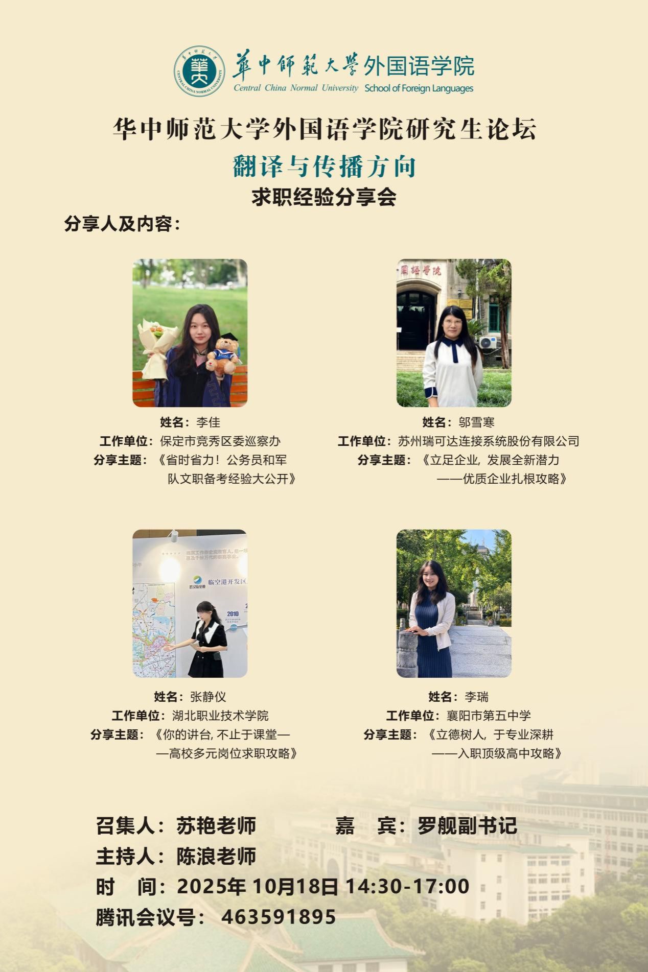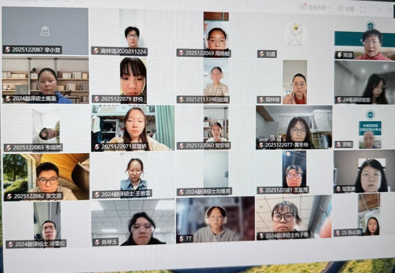 10月18日下午,华中师范大学外国语学院成功举办了一场线上求职经验分享会。本次活动由苏艳老师组织,陈浪老师主持,学院党委副书记罗舰书记出席。分享会通过腾讯会议平台进行,吸引了众多在校本科生和研究生参与。