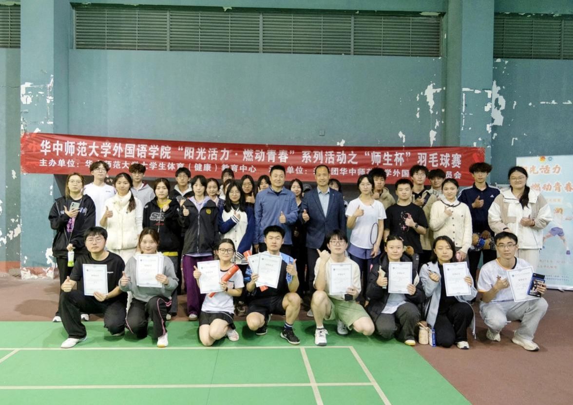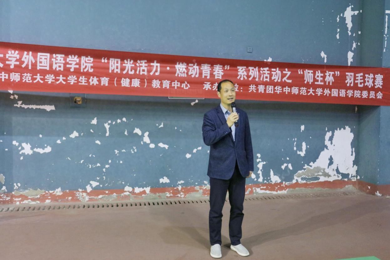 3月27日,华体会官方版网站登录入口(以下简称“外院”)顺利举办“阳光活力·燃动青春”系列活动之“师生杯”羽毛球赛。本次比赛由华中师范大学大学生体育(健康)教育中心主办,共青团华体会官方版网站登录入口委员会承办。外院党委副书记罗舰、团委书记吴波及全体师生选手参加开幕式。外院学生会文体中心成员马茗芷担任主持。